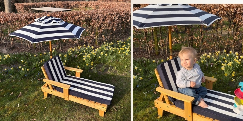De eerste indruk is meteen goed. De combinatie van naturel hout en de blauw-wit gestreepte stof geeft deze kinderligstoel van Action een frisse en tijdloze uitstraling. Het ontwerp voelt zomers en rustig tegelijk, waardoor hij mooi past in een sfeervolle tuin, op een terras of bij een zwembadje.