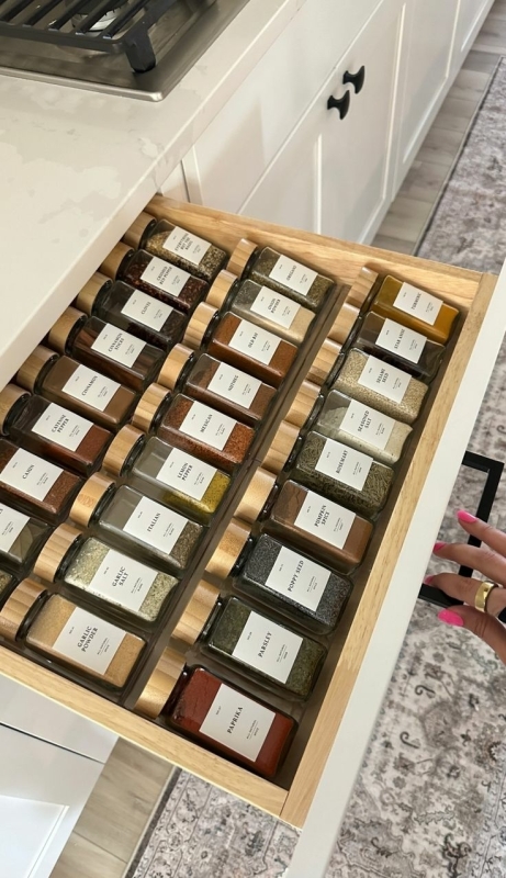 Glazen kruidenpotjes in een keukenlade werken alleen prettig als vorm en opstelling kloppen. De belangrijkste keuze is rond of vierkant, in combinatie met een liggende organizer.