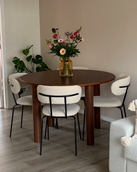 Met de juiste lamp en het juiste kleed voelt je ronde eettafel meteen als een bewuste keuze die helemaal klopt.