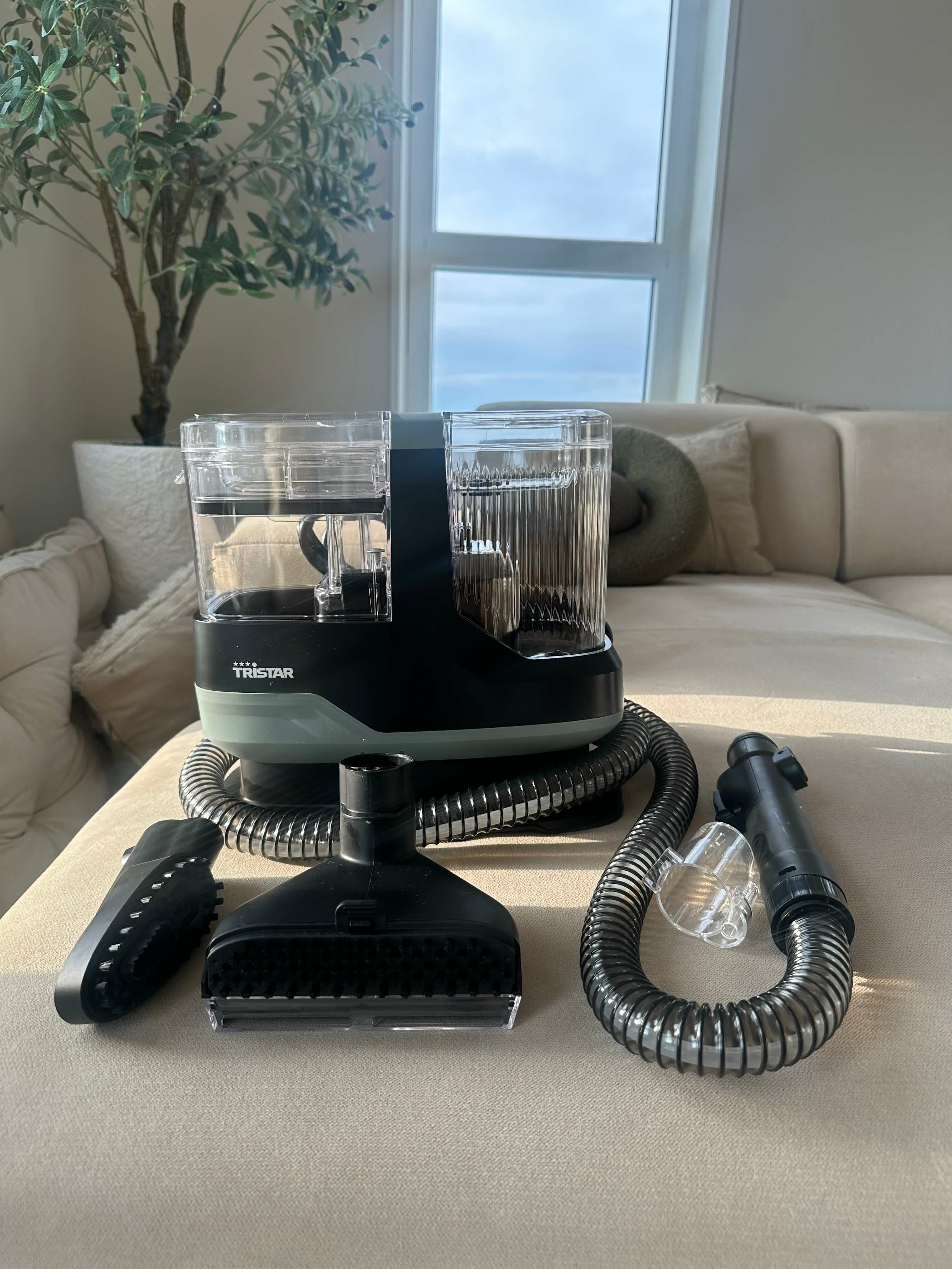 De Tristar Spot Cleaner van Action is een compacte vlekkenreiniger met stoomfunctie (1800W), een vuilwaterreservoir van 1,5 liter en een snoer van 3,5 meter. In onze test haalde hij make-upvlekken uit een teddy bouclé poef met de stoomstand, zonder dat we eerst een vlekkenspray hoefden te gebruiken. En dat voor €69,95, terwijl stoomreinigers met dit soort vermogen en opties vaak eerder richting €200+ gaan.