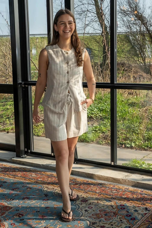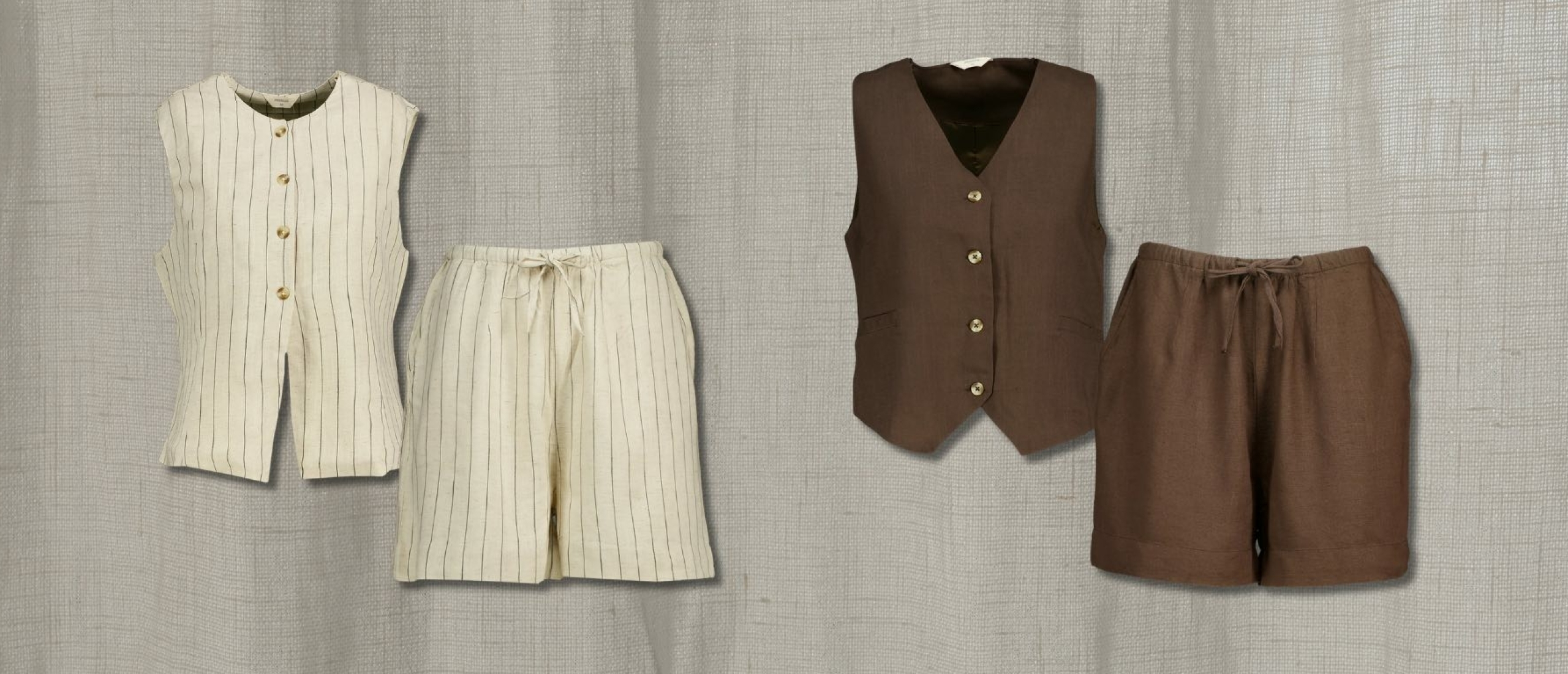 De setjes lenen zich ook goed voor laagjes. Een linnen gilet over een simpele T shirt geeft meteen meer diepte aan je outfit zonder dat het te warm wordt.