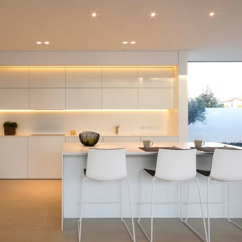 Een veelgemaakte fout is een strak raster over het hele plafond, waardoor je woonkamer al snel aanvoelt als een kantoor. Beter is om met zones te werken. In de keuken meer gericht licht boven het aanrecht en kookeiland, in de zithoek zachter en minder spots, en bij een kastwand juist een rij die het oppervlak mooi uitlicht. Zo voelt dezelfde ruimte meteen warmer en slimmer ingericht.